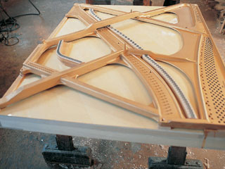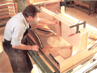The heart of every fine piano is its soundboard. Only a board of spruce with an even grain structure can guarantee a full, rich tone in the finished instrument.