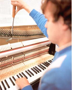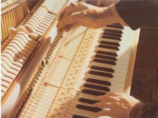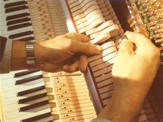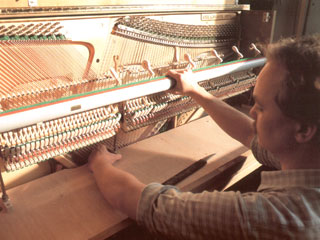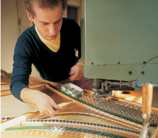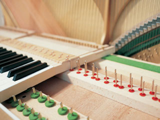 The hammer felt is pricked with needles to release inner tensions and make it softer, resulting in a mellow rather than a metallic tone. The fine toning (voicing) eliminates any remaining harshness and ensures a uniform sound throughout the entire keyboard compass.
